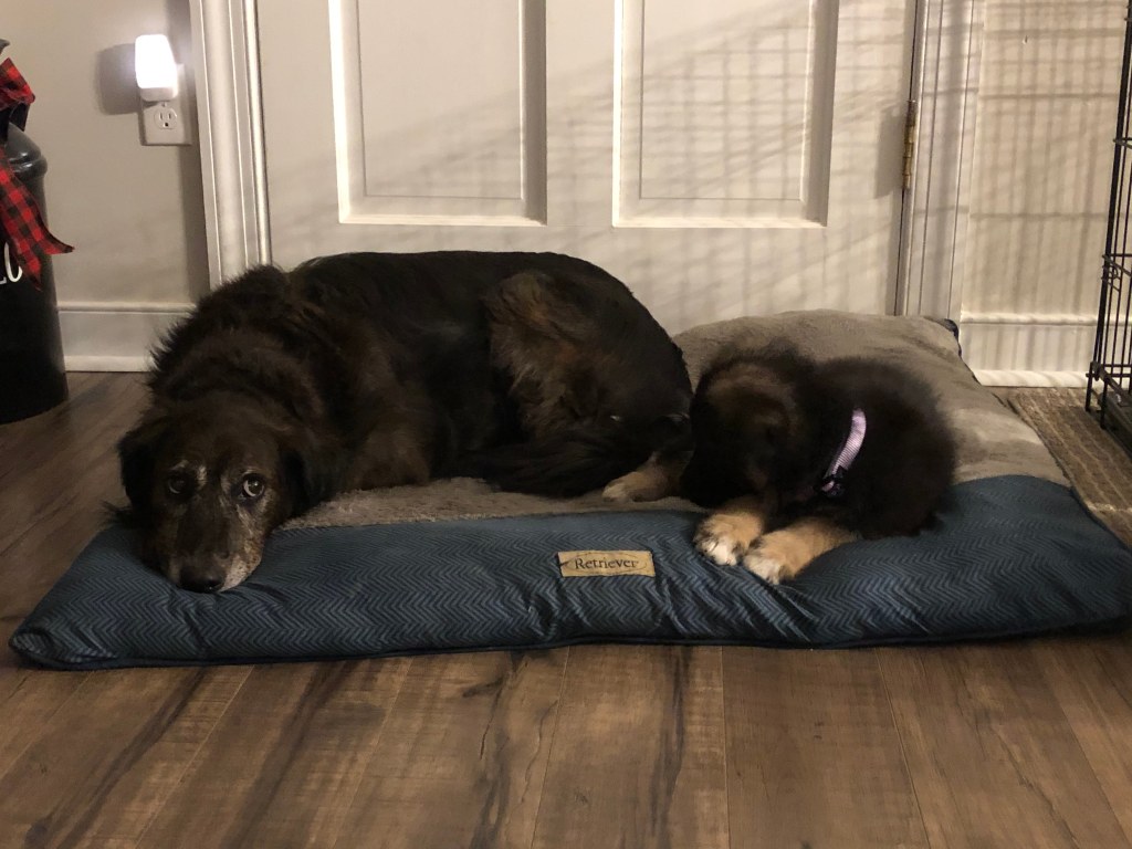 > I’m having a great time with my new family! I love to eat mulch and chew sticky balls outside. I’ve met the chickens and only chased them around once otherwise we just hang out together. My new dog brother is a grump but he’s starting to play with me more and isn’t too mad that I’ve taken over his dog bed.