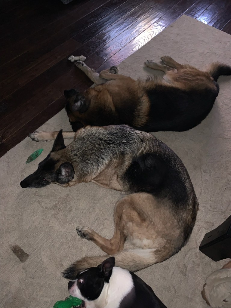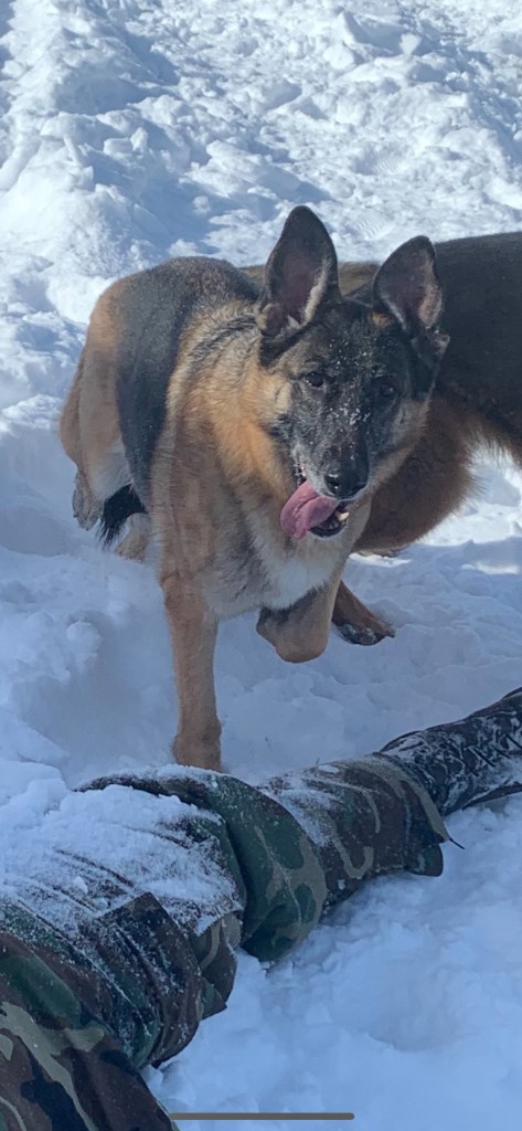 I had a litter of puppies out of Nellie in October, 2013. Johnny and Jane’s sister went to a family in Canton, Ohio eight years ago today. They named her Maggie. Here are pics of Maggie when she was first adopted and now. They already had a male Shepherd and he is over 10 years old in these pictures. I’m told that Maggie likes to retrieve apples and then eat them! She runs a lot and stays in shape. She loves the snow. She looks so much like Jane I can hardly tell them apart! I’m always glad to hear from people who have gotten my puppies. Dawn and her husband take wonderful care of her and their other dogs! Thank you for the great pics, Dawn!