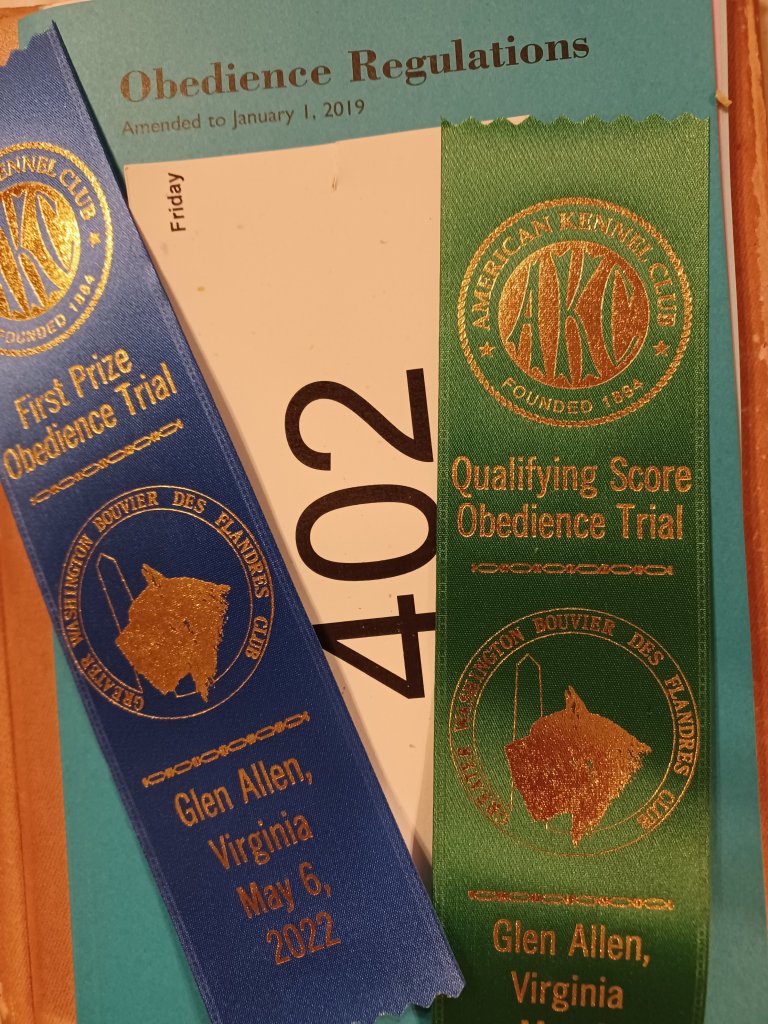 For the first time in over 45 years I had a dog in The Obedience ring. Winston was entered in beginning novice at the greater Washington Bouvier Club in Glen Allen today. On his first time out he got his first “leg”, or qualifying score, towards his Beginning Novice title (3 legs earn the BN title). It’s the lowest level of obedience. I’m particularly proud that he got this on his first try less than six weeks from when he finished his championship in AKC conformation. After all, dogs are taught not to sit in the confirmation ring and then must sit automatically in the Obedience ring. He wasn’t perfect: he got a a score of 187 out of a possible 200. But he was the only dog out of six in Beginning Novice to qualify today! So we got a first place ribbon in addition to the green qualifying ribbon.