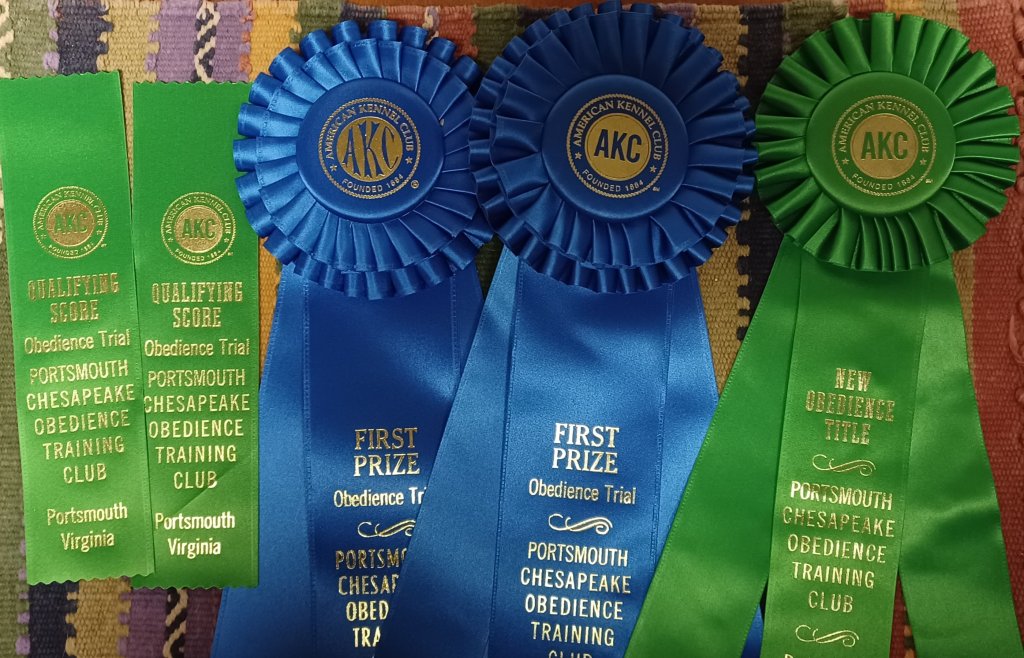 The Portsmouth Chesapeake Obedience Training Club (PCOTC) gives prizes for first place, so I got $20 and a nice new 6 ft leather lead in addition to the ribbons. Thank you, PCOTC!