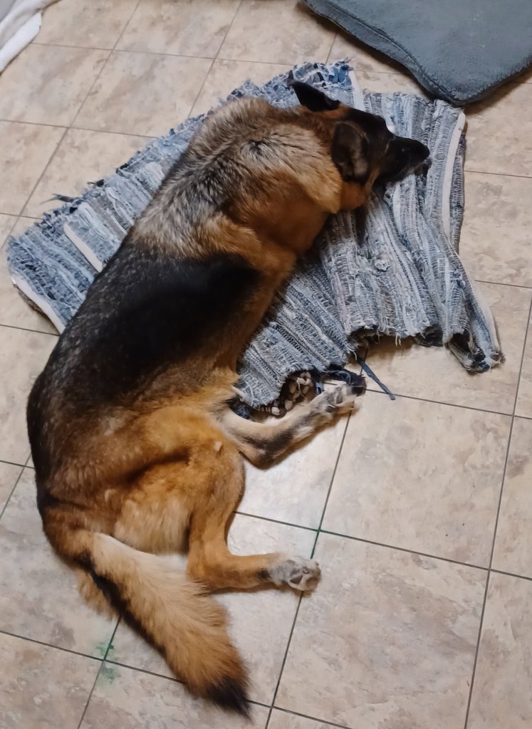 My German Shepherd, Jane, is 10 years old. A couple of weeks before Thanksgiving, she started having some trouble with lameness in her hind legs (especially the left) and sometimes her legs would really sag, and she seemed to have no strength in them. Then, the next day, I would see her trotting effortlessly. I thought she probably had a disc problem, so I gave her Rimadyl, which seemed to help.