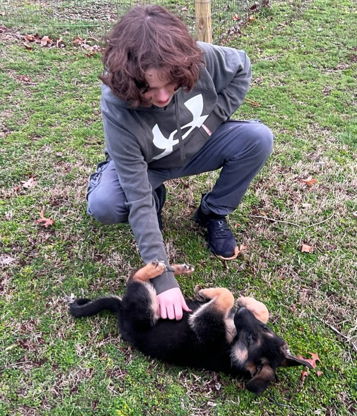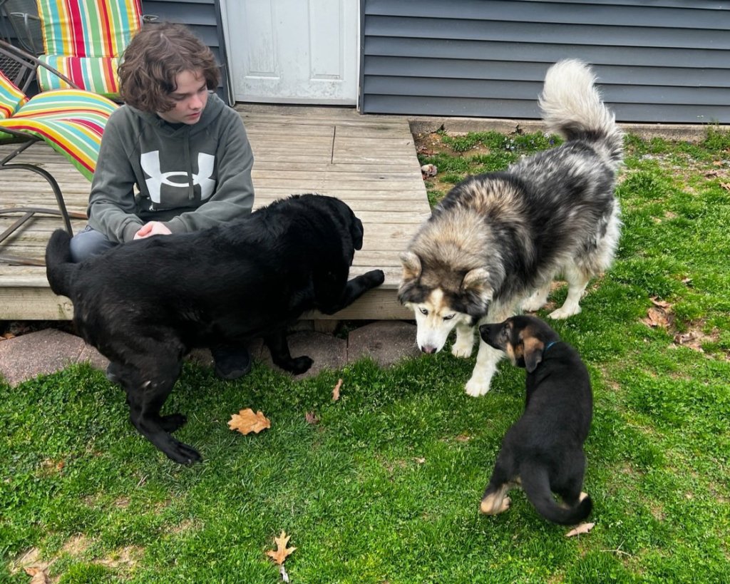 Duke’s new family has two other (neutered) mature dogs: a male black lab Magic, and a large female northern breed mix Macie. They are accepting him into the pack nicely. Luke, his sister, and parents got to watch the puppies grow up and helped socialize the whole litter, so they already love him dearly. Duke seems quite content, as you can see by these pics.