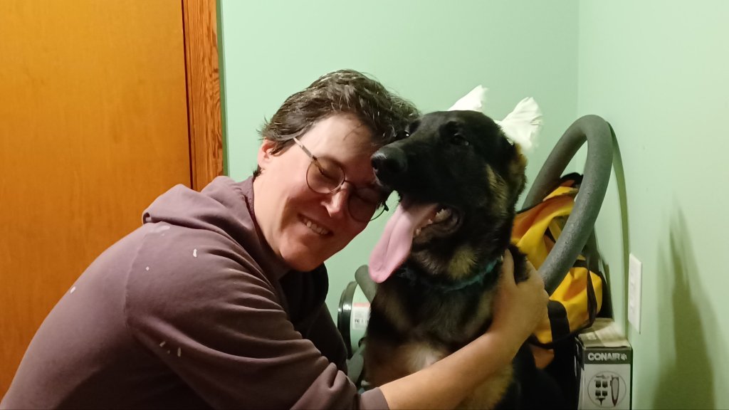 At 4 months, GSD puppy ears need to be carefully evaluated. Frasier/Günther’s ears had been up and down, and because Aimee lives near DC, we decided to save her a trip and do it now. Best case scenario, the tape can stay on for 2 weeks, and Aimee can see great ears after that. She was instructed to check the ears daily to make sure air is getting inside the ear and for any signs of infection. The tape has to stay dry, so she has to be dedicated to using an umbrella if necessary to take him out. He didn’t seem to mind the taping. Afterwards, he shook his head a couple of times and said, “Whatever! No problem.”