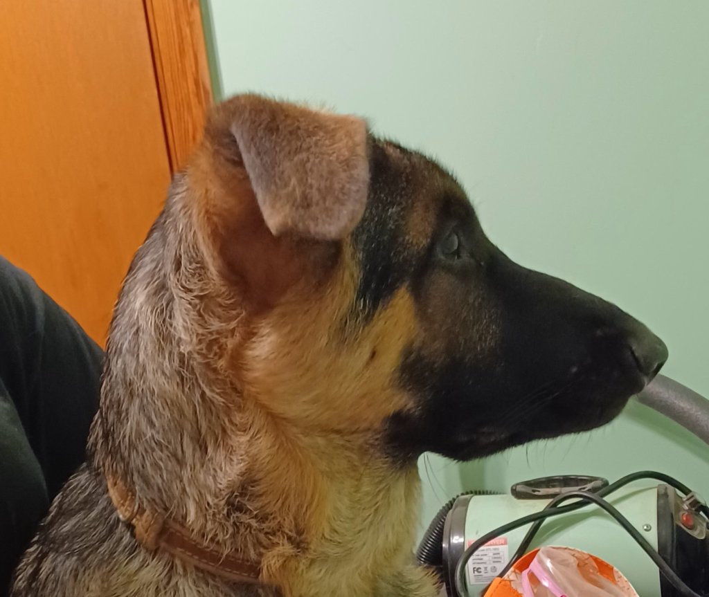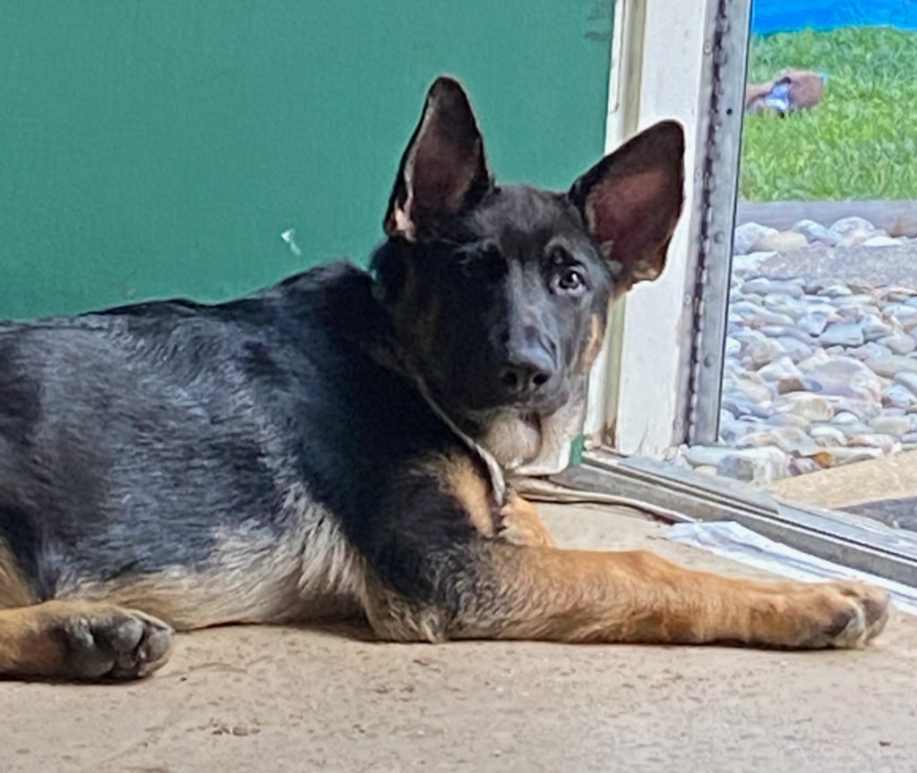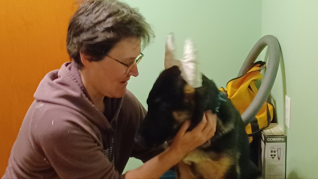 I have to admit I had my hopes up that I would not have to tape ears on this litter of puppies. I had to tape their mom’s (See See’s) ears, so I bred to a sire (Luc) with really good ears. All of the puppies have had both ears up. Usually, when GSD ears have been up, they will go back up even if they come down during teething. However, if the ear starts to crease, it is advisable to tape to make sure the ear ultimately will stand. So yes, there were creases developing, and therefore, I bit the bullet and taped four out of five of the puppies’ ears. Here are before pictures and an after video.