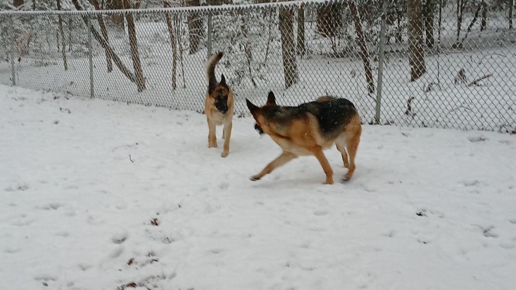 First, because Daphne was in heat, I put her in with neutered Winston. She was pushy with him too, but he didn’t fight back. But ultimately he avoided even going out in the yard with her, and so I had to make a change because he seemed miserable with her. Solution: after her heat cycle, I put Daphne in with Clyde. Clyde. Did. Not. Take. Any. Crap. From. Daphne. Clyde and Daphne now get along great. Her attitude has changed. She no longer thinks she is the queen of the world.