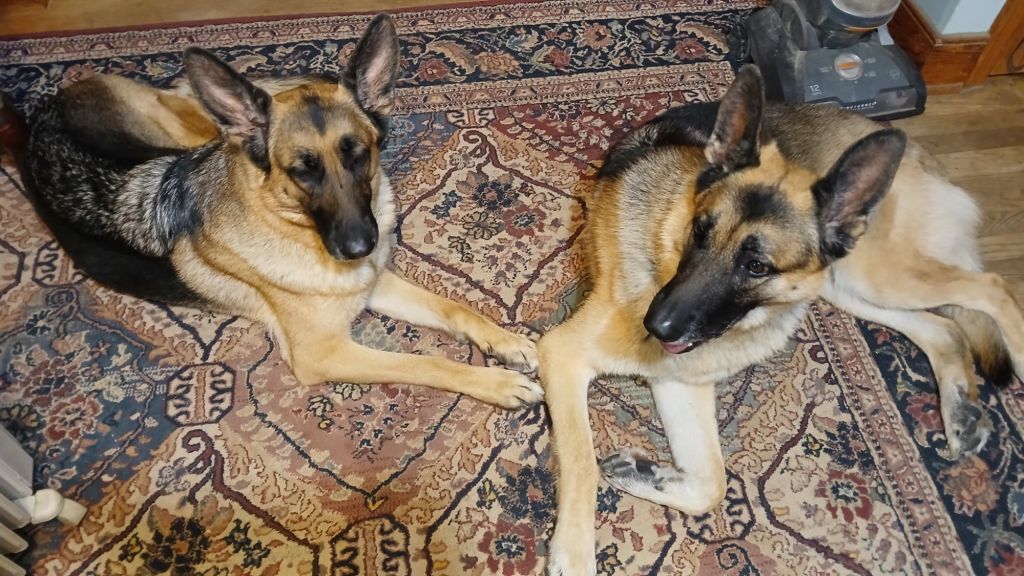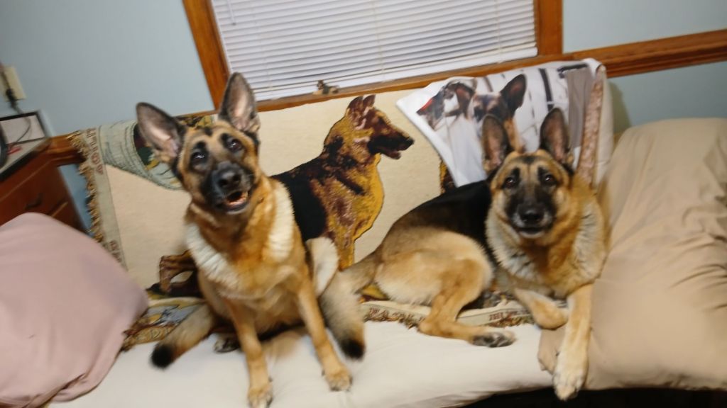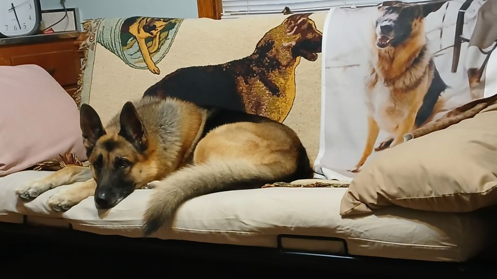 Niles, now named Zero, visited the other day. I wanted to see him around the age of two, to evaluate him to see if he should be shown or bred. Right now he seems too thin, and immature for his age. He looks more like a 1yr old! But that’s not necessarily a bad thing. Some GSDs, especially males, are slow to mature. I talked to his owner about different foods and supplements, and he’s going to try a new approach to try to build him up.