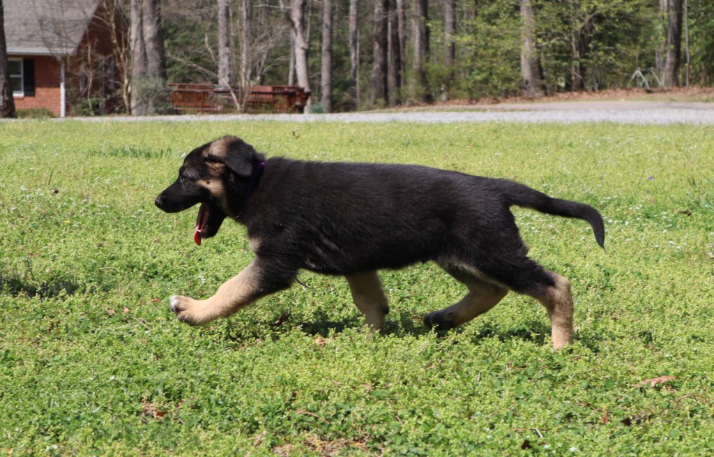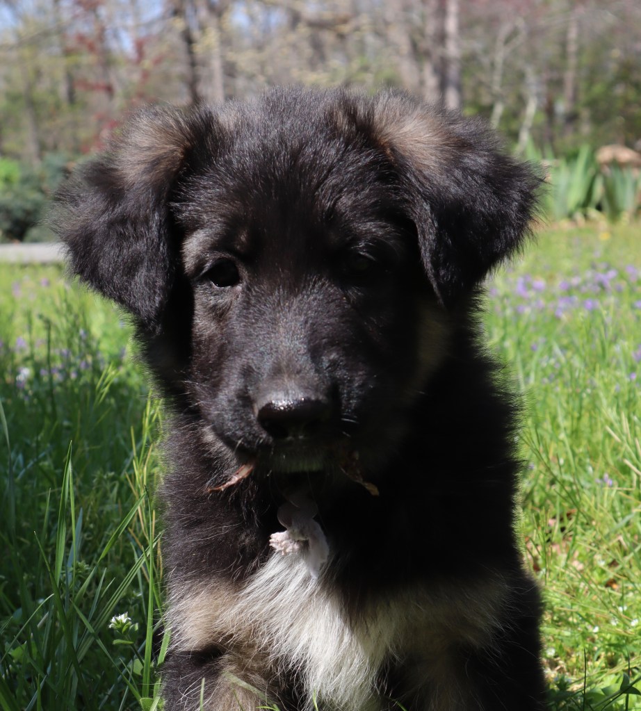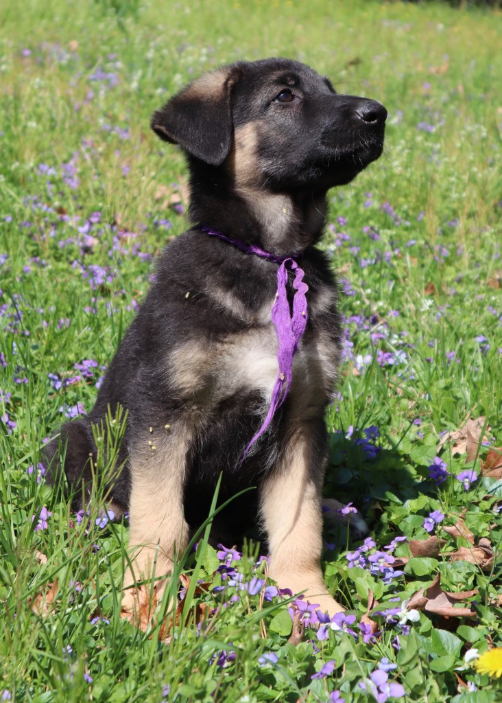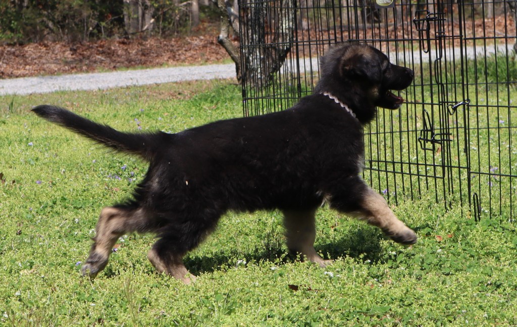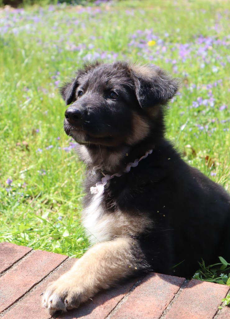 I also have a longhaired female who I call Cherry (Percheron). (White collar) She is friendly and sweet natured, and already used to being brushed and combed. She’s a problem solver, being the first puppy to get in and out of the whelping box on her own. She has a significant amount of white on her chest which looks quite striking. She should go to someone who sees value in the bonding experience that regular grooming creates. Although longhairs do not look like typical GSDs, they are stunningly beautiful when their coats are well maintained. Here is Cherry!