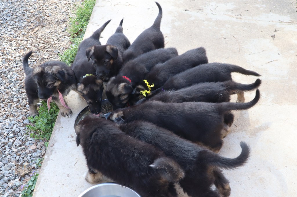 At 8 weeks old, these puppies are the perfect age to begin the bonding experience with a new family. Right now, I have two puppies still available from a litter of eleven including one normal coat male. I call him Quarter (Quarterhorse), and he is wearing the purple collar that you can also see in past pictures. He is lively with a big boy head, and will probably be large with nice dark colors. He knows his name! He should go to someone who has had a GSD before. These are up to date pics.
