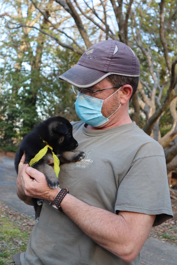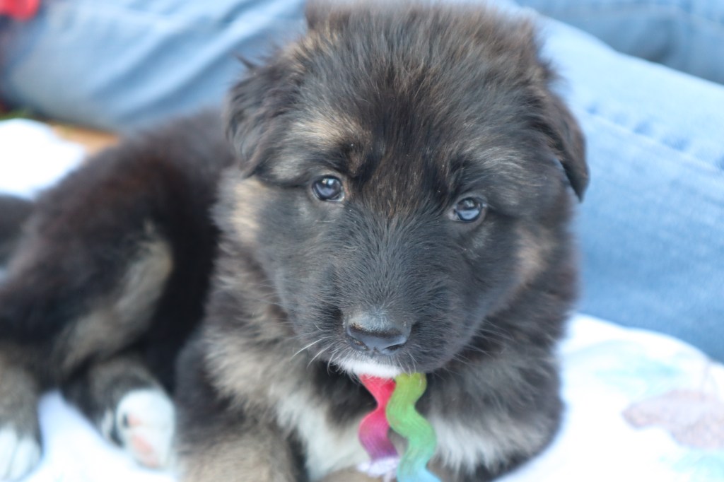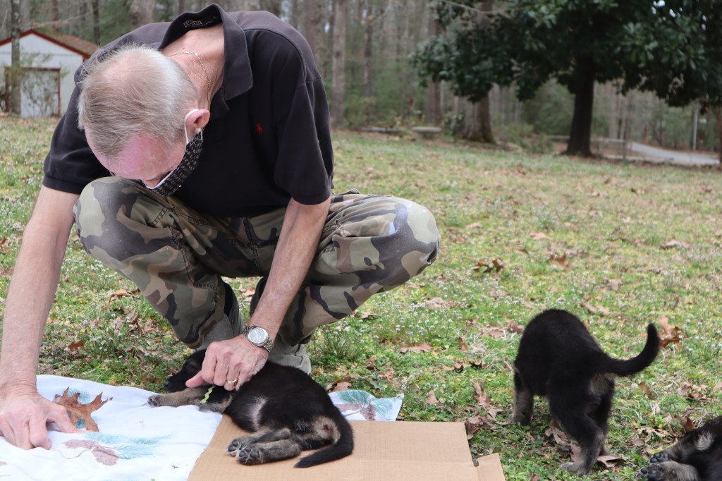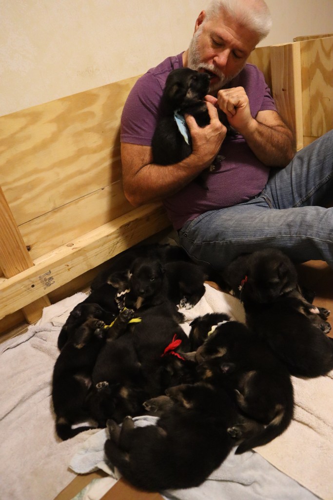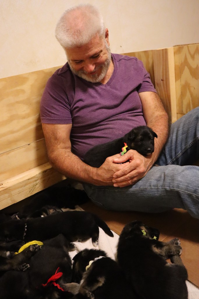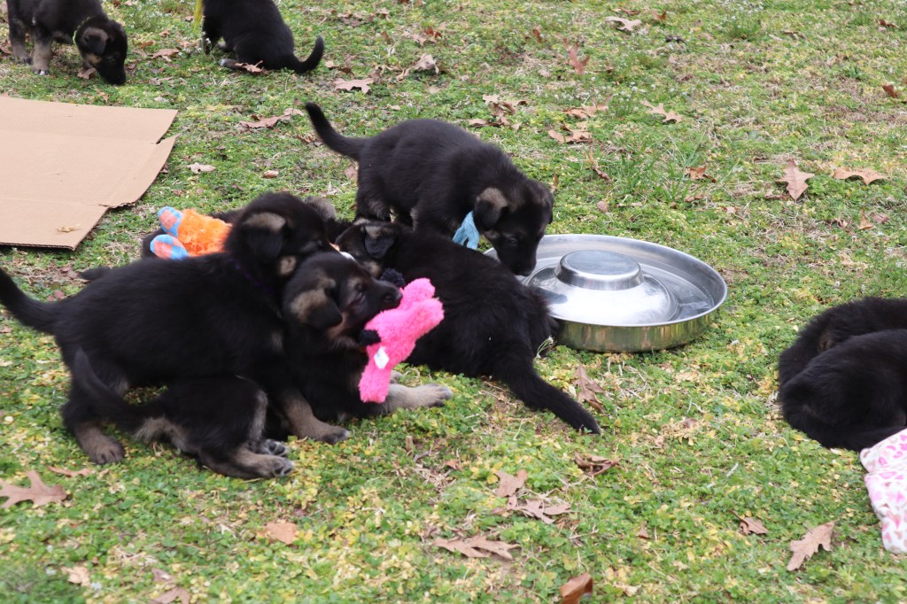 German Shepherd puppies reach certain milestones as they mature, and it is exciting to watch. In some of these photos, you can see the pups “piling up”, but they are starting to have a little independence, seek out people, and play with toys. They certainly continue to enjoy being held and loved during their now mostly outdoor socialization sessions with neighbors, friends, and potential buyers. In these pics, the puppies are between 4 and 5 weeks old.