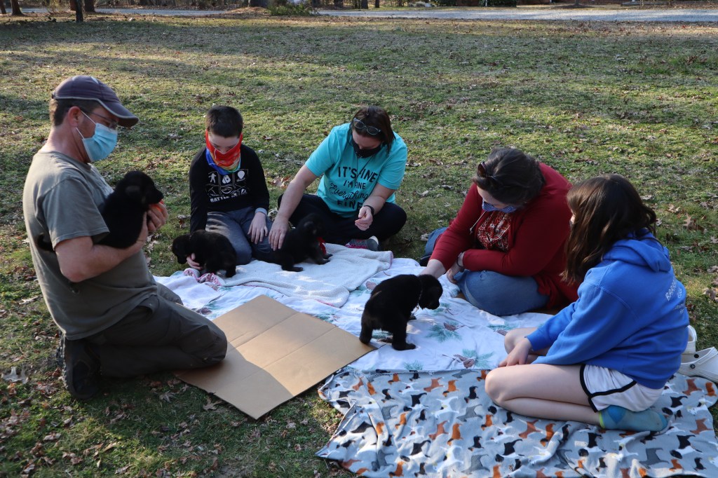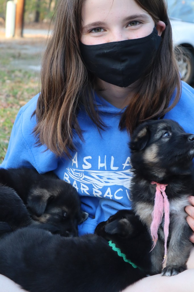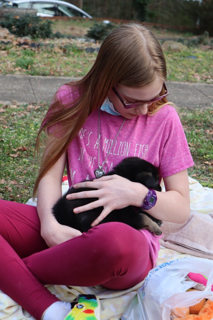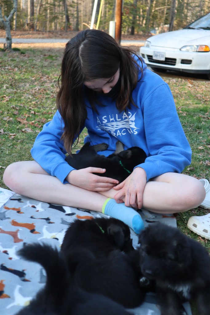 The puppies enjoyed a visit today by a family interested in a boy puppy. They got to be petted and loved by a very nice girl. SO IMPORTANT to get early socialization with young children! Very positive experience for all today.