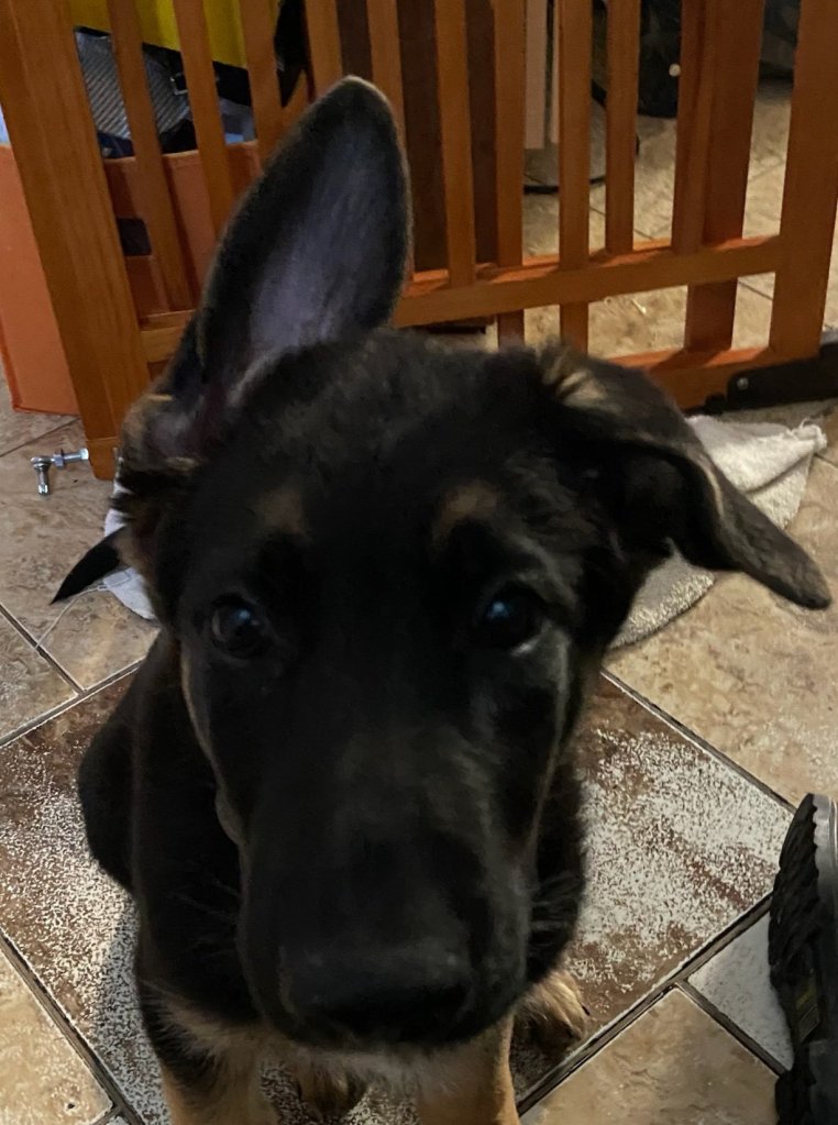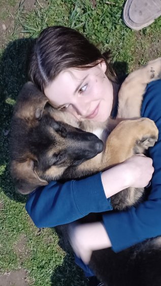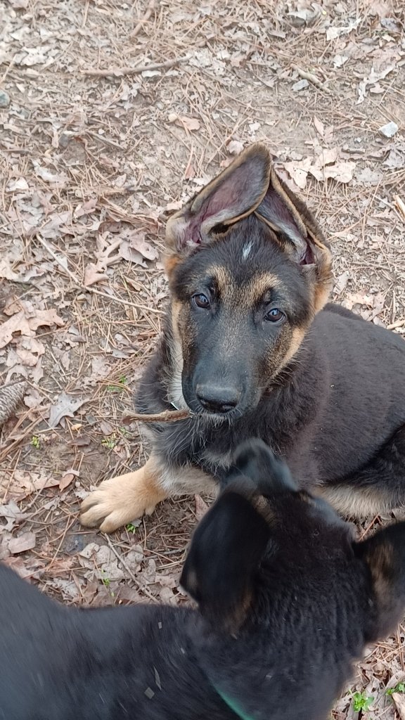 The puppies are now crate trained and well socialized. The male is laid back and very outgoing with people and likes playing with other dogs. He has been to stores and puppy classes, and he is leash trained. He will likely be a very large adult.